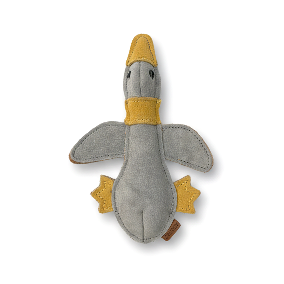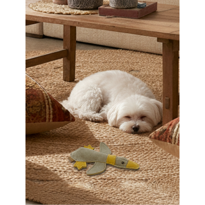 Deze handgemaakte eend is het ideale hondenspeeltje voor bewust spelen met kleine honden. Met een totale lengte van ongeveer 19 cm en een breedte van ongeveer 12 cm van vleugeltip tot vleugeltip nodigt hij uit om op te kauwen, aan te trekken en te apporteren, zonder pieper.